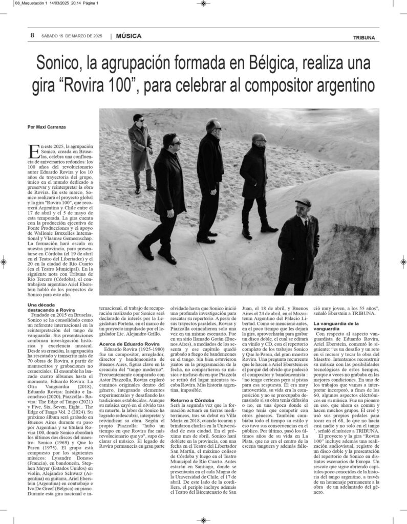 diario TRIBUNA, Argentina 15/03/2025 "Sonico, la agrupacion formada en Bélgica, realiza una gira “Rovira 100”" READ